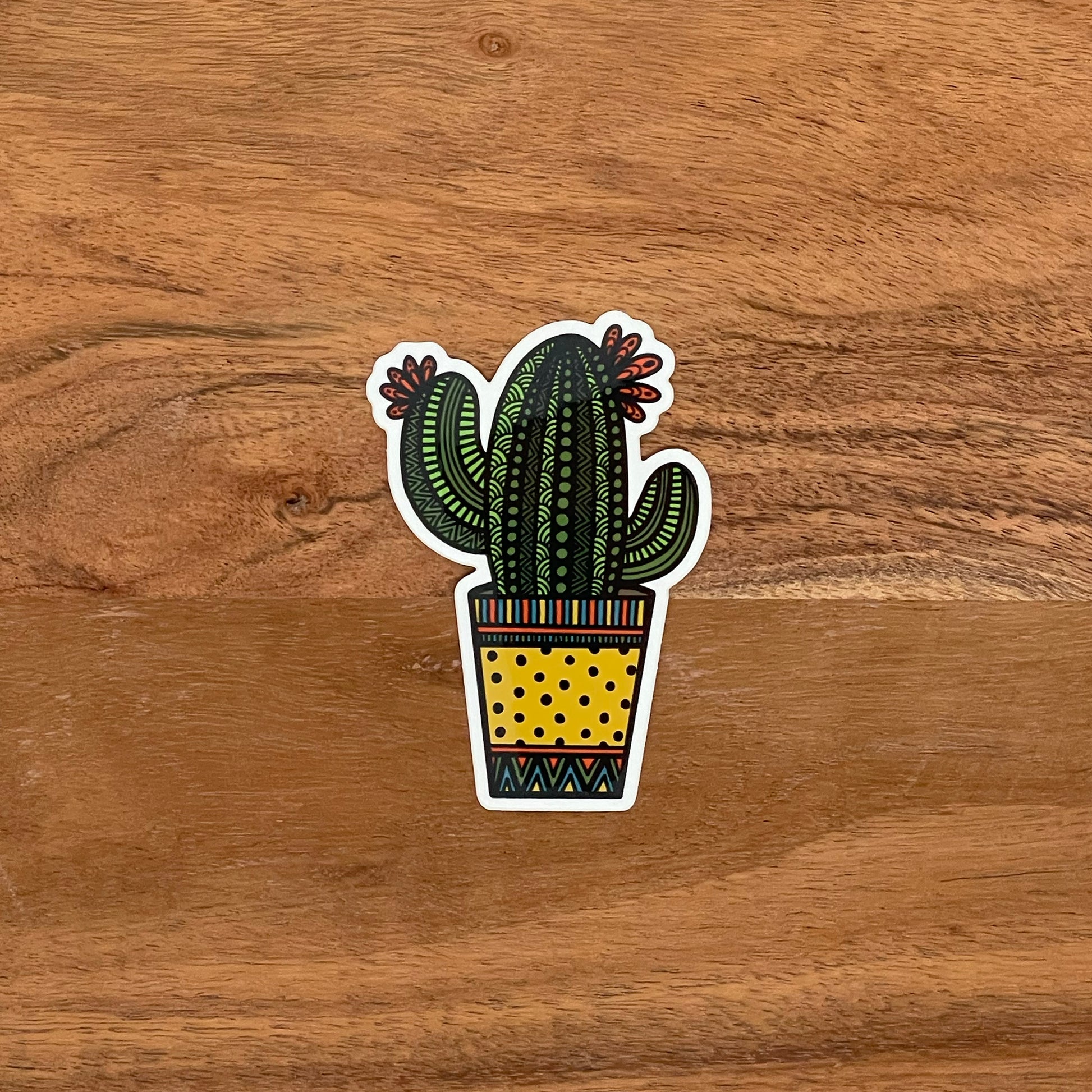 Hand-drawn potted cactus illustration made into a vinyl, waterproof die-cut sticker. Decorate your water bottle, laptop, bulletin board, planner, and more! Durable enough for cars and snowboards!