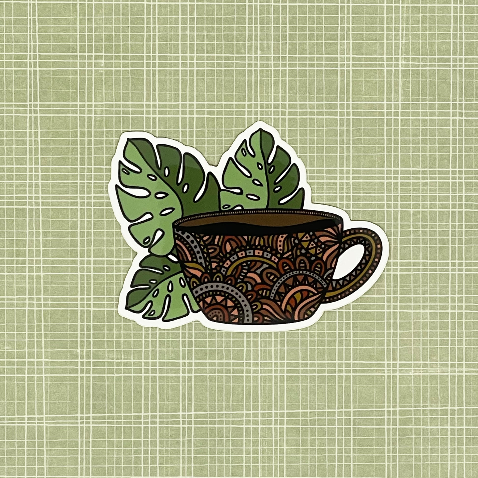 Sticker 1: Hand-drawn coffee and monstera leaf illustration made into a vinyl, waterproof die-cut sticker. Decorate your water bottle, laptop, bulletin board, planner, and more! Approximately 3.2ā wide x 2.4ā height