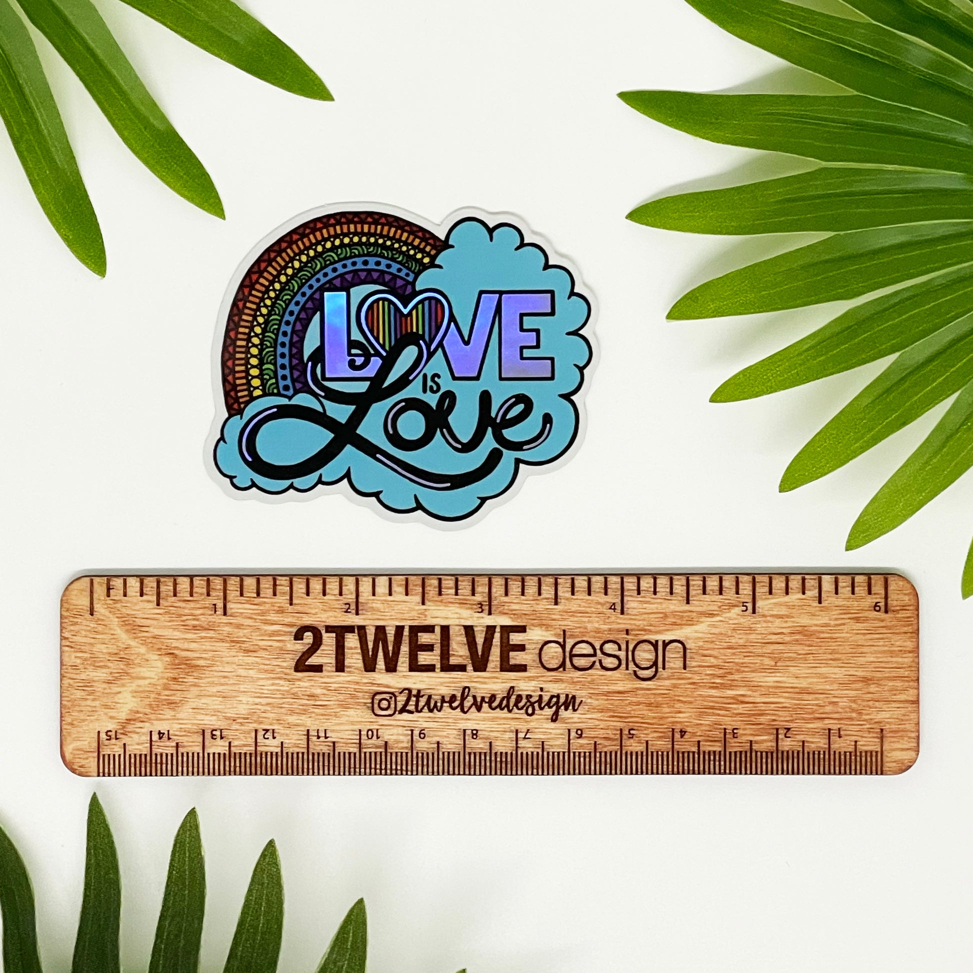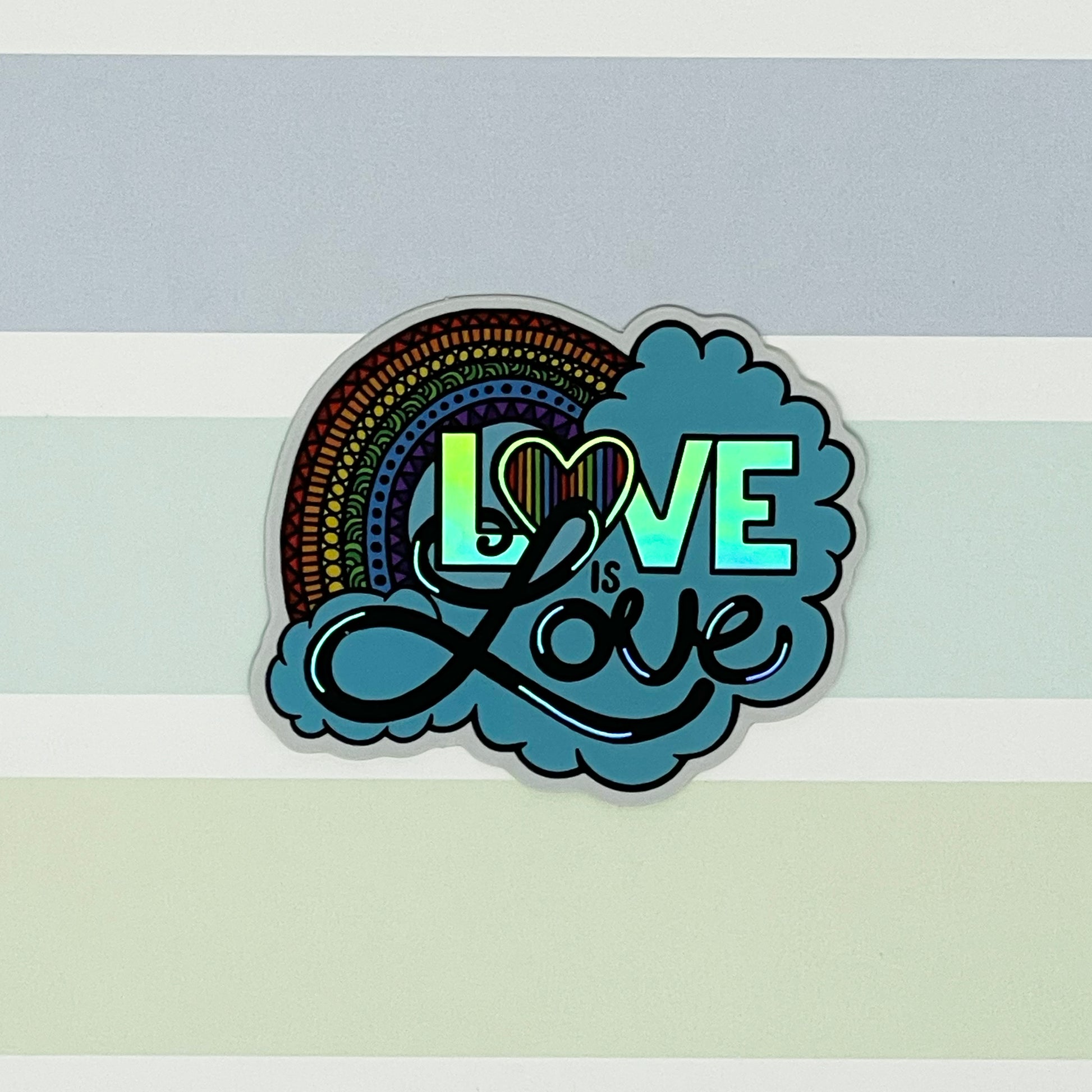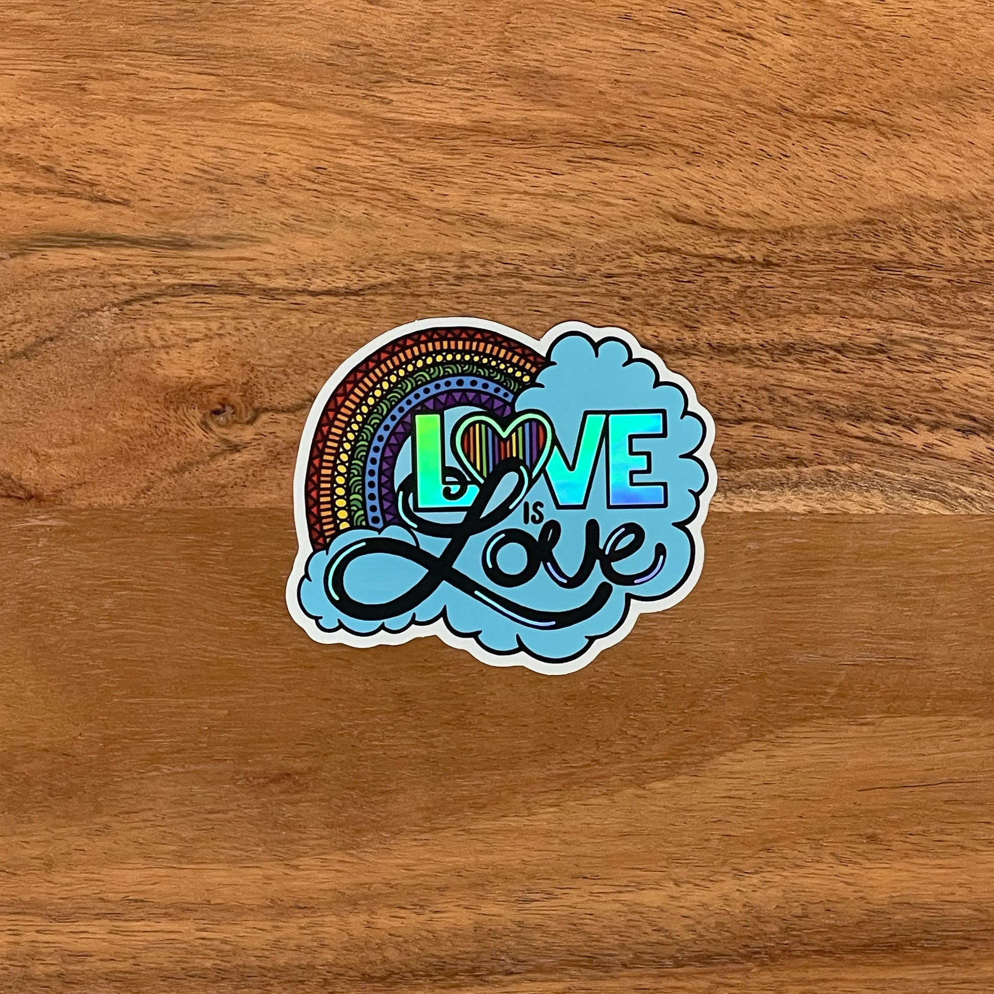 Hand-drawn Love is Love illustration made into a vinyl, waterproof die-cut holographic sticker. Decorate your water bottle, laptop, bulletin board, planner, and more!