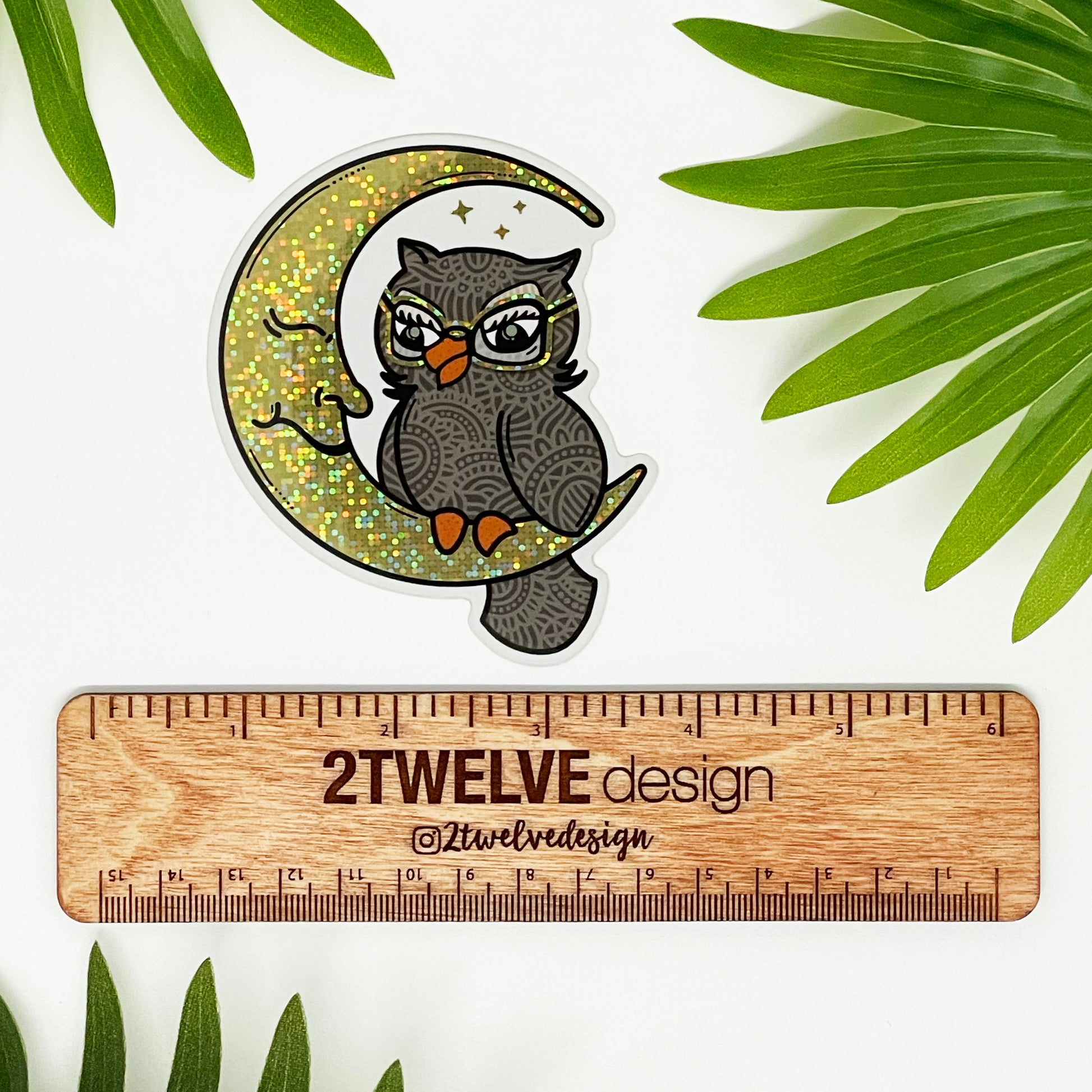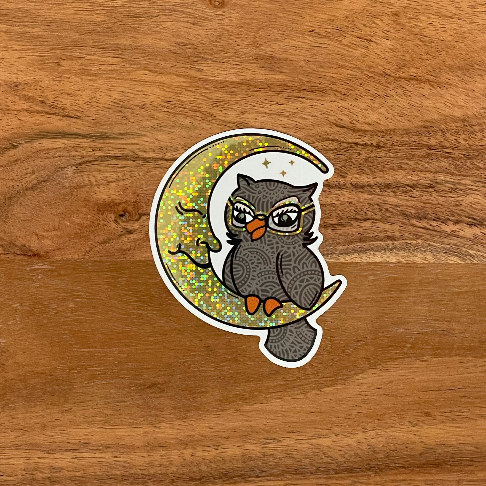 Hand-drawn owl and moon illustration made into a vinyl, waterproof die-cut glitter sticker. Decorate your water bottle, laptop, bulletin board, planner, and more!